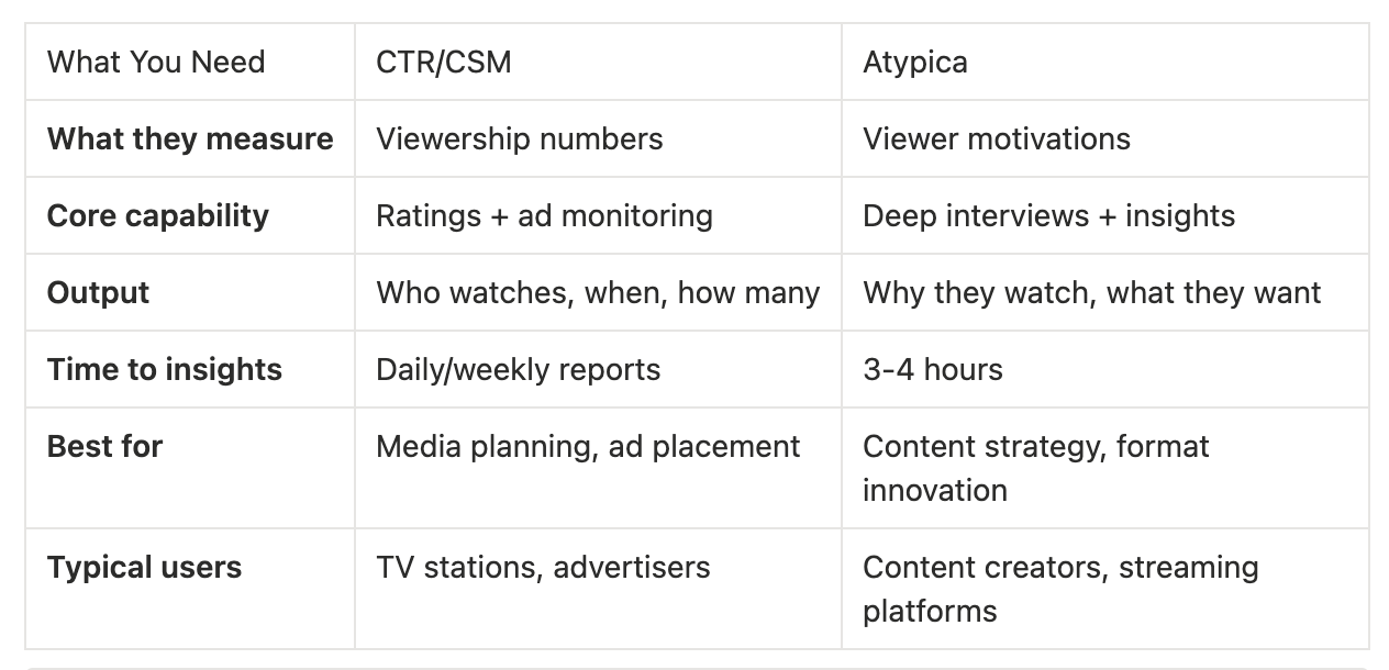 比较 Atypica 的 AI 用户研究与 CTR 的电视收视率和广告监测。了解何时使用定性洞察与定量媒体数据来制定更好的内容策略。
